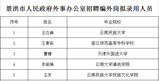 根据《景洪市人民政府外事办公室公开招聘编外岗位人员公告》有关规定,经笔试、面试等程序,现确定下列人员为拟录用人员: