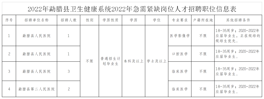 招聘岗位、人数、专业、资格条件等详见《勐腊县卫生健康系统2022年急需紧缺岗位人才招聘职位信息表》(附件)。