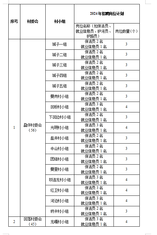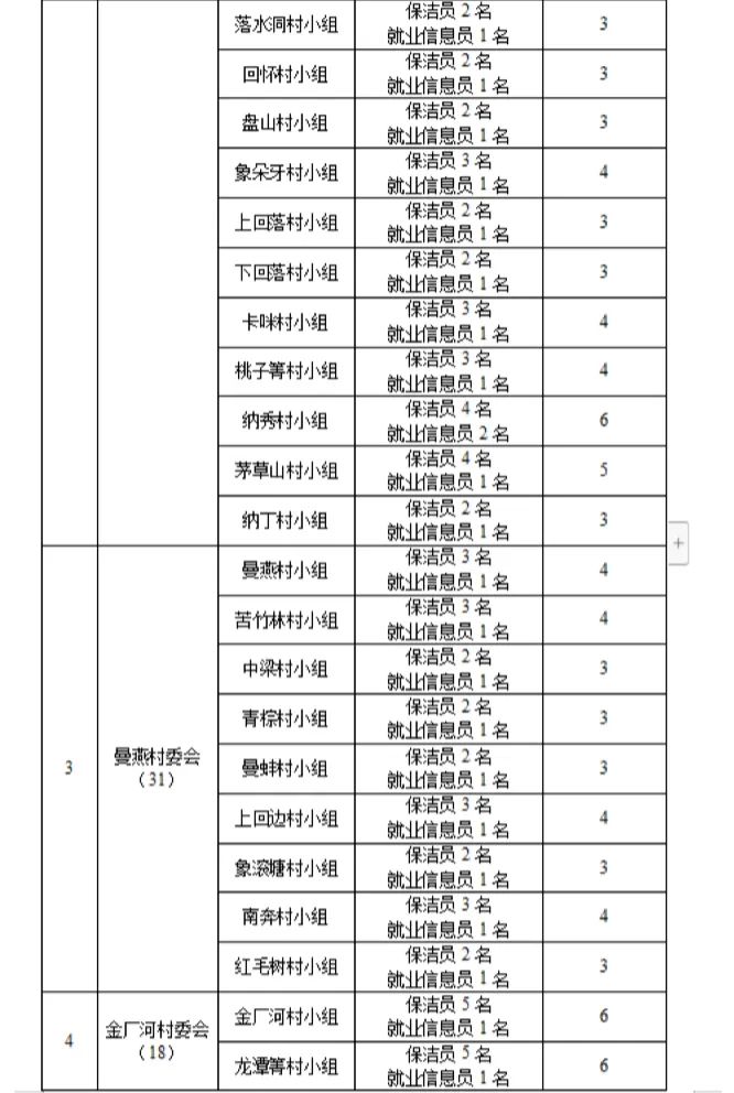为贯彻落实党中央、国务院关于乡村振兴战略的决策部署,严格落实“四个不摘”要求,持续做好我镇脱贫人口家庭就业帮扶,巩固拓展脱贫攻坚成果同乡村振兴有效衔接。根据《勐腊县促进就业工作领导小组办公室关于2024年乡村公益性岗位开发安置相关工作的通知》腊就业办发〔2023〕10号文件精神和具体要求,结合勐伴镇实际情况,经研究,决定开发勐伴镇150个乡村公益性岗位(含监测对象5个)。现向全镇各村小组发布乡村公益性岗位选聘信息,公告如下: