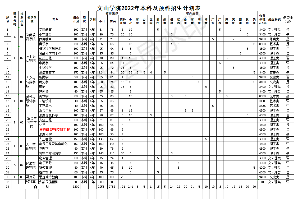 文山学院2022年本科及预科招生计划表