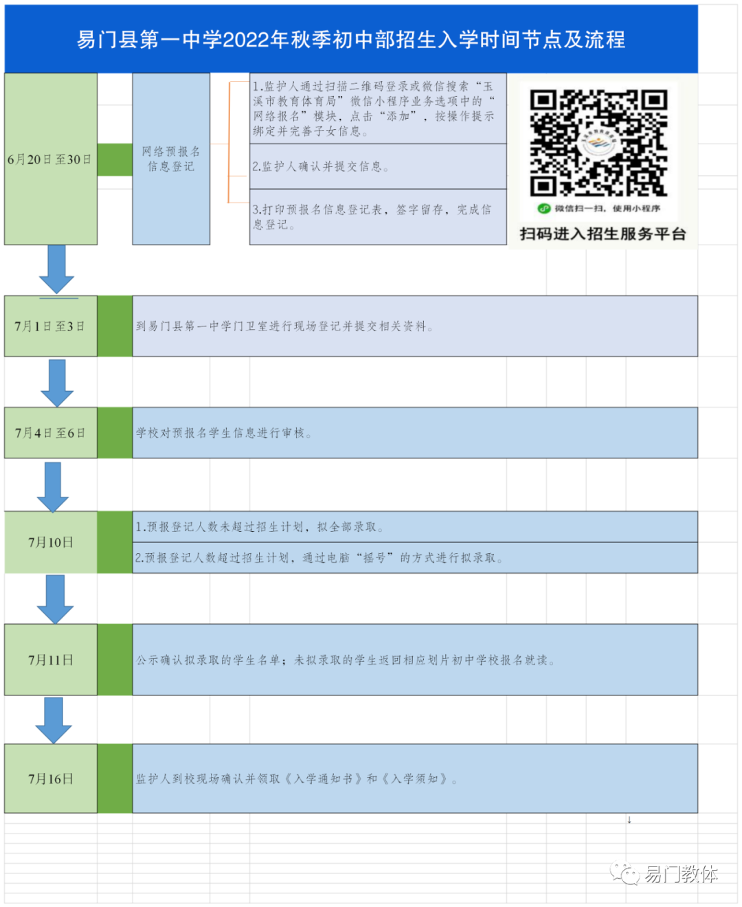 (一)网络预报名信息登记:第一监护人于2022年6月20日-6月30日进行网络信息登记,监护人通过扫描二维码登录或微信搜索“玉溪市教育体育局”微信小程序业务选项中的“网络报名”模块,点击“添加”,按操作提示绑定并完善子女信息。家长确认并提交信息。提交成功后,打印《预报名信息登记表》签字留存,待现场报名时提交审验。