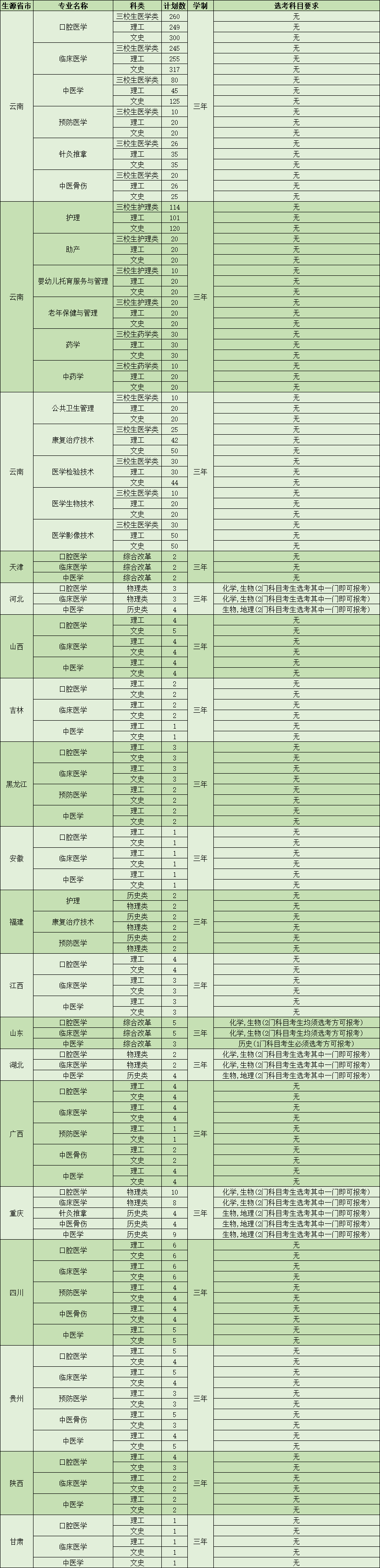 2022年昆明卫生职业学院高职专科分省招生计划