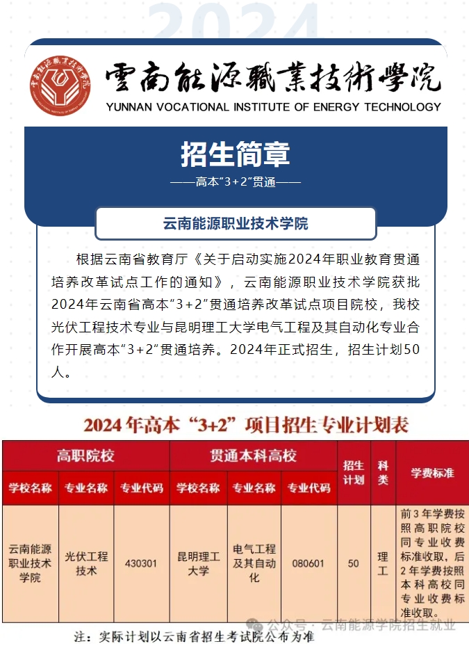 云南能源职业技术学院光伏工程技术高本“3+2”贯通招生简章