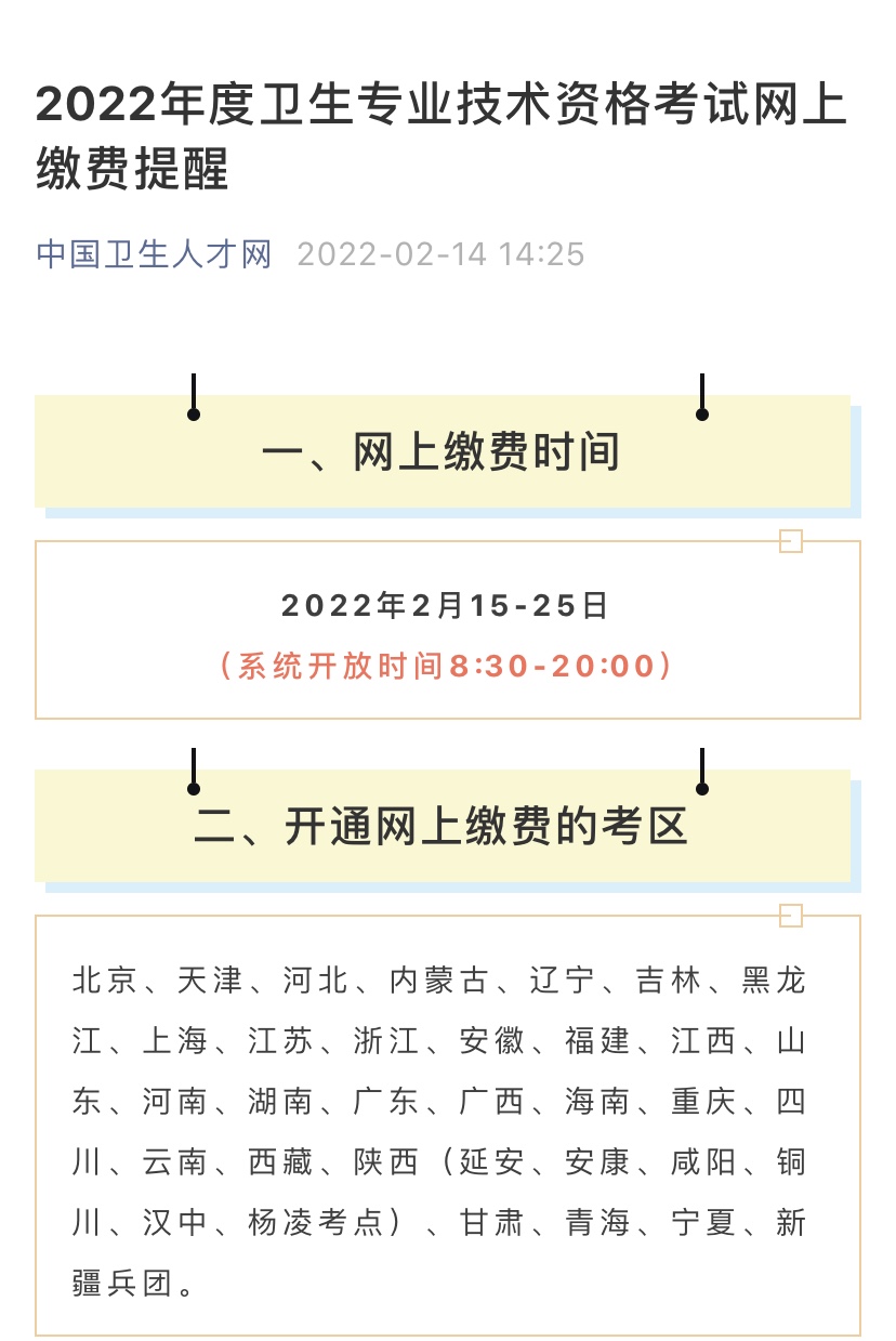 2022年度卫生专业技术资格考试网上缴费提醒