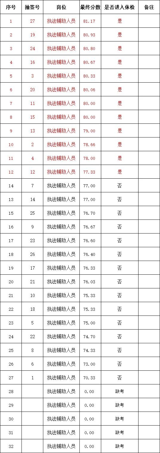 根据《澄江市交通运输局公开招聘交通运输综合行政执法辅助人员招聘公告》要求,面试于2024年1月16日结束。现将面试成绩及进入体检人员名单公示如下: