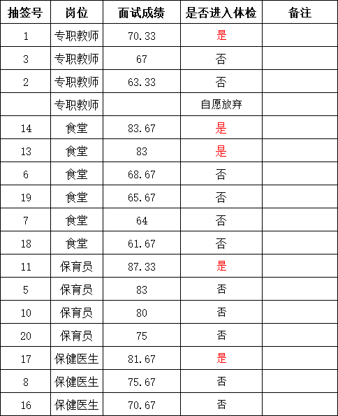 澄江市机关幼儿园立昌园区劳务派遣工作人员面试成绩公示及进入体检人员的通知