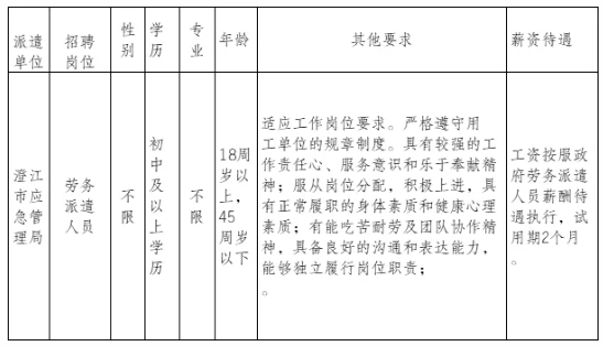 澄江市应急管理局因工作需要,委托澄江市启澄人力资源有限责任公司面向社会公开长期招聘劳务派遣人员,招聘相关事项如下: