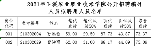 根据《2021年玉溪农业职业技术学院公开招聘编外人员公告》,经报名、资格审查、笔试、面试,体检和政审合格,确定拟聘用人员,现公示如下: