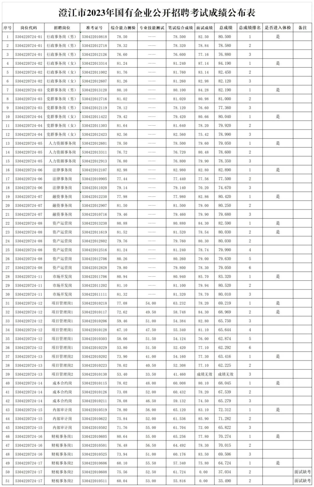 澄江市2023年国有企业公开招聘工作人员综合成绩公布及体检通知