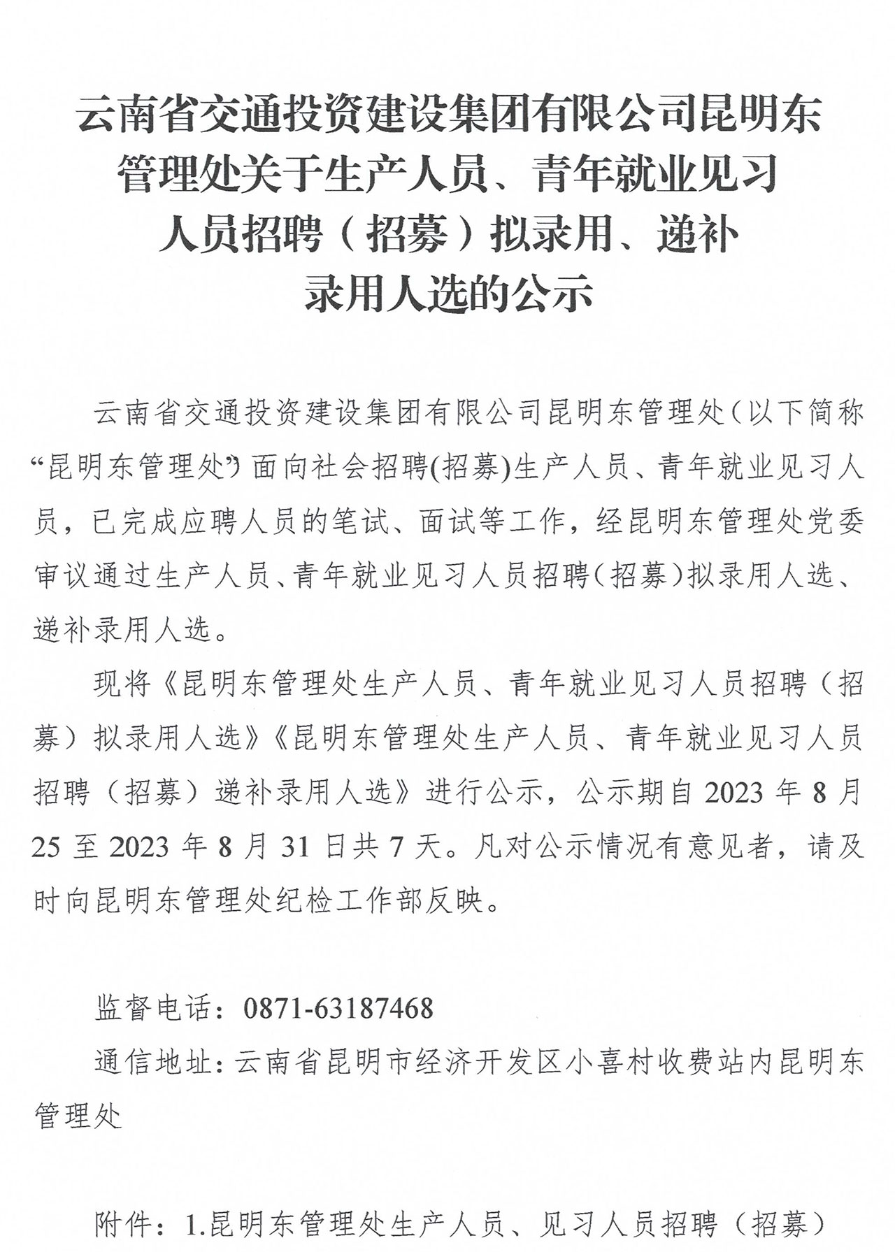 附件1:昆明东管理处生产人员、见习人员招聘(招募)拟录用人选