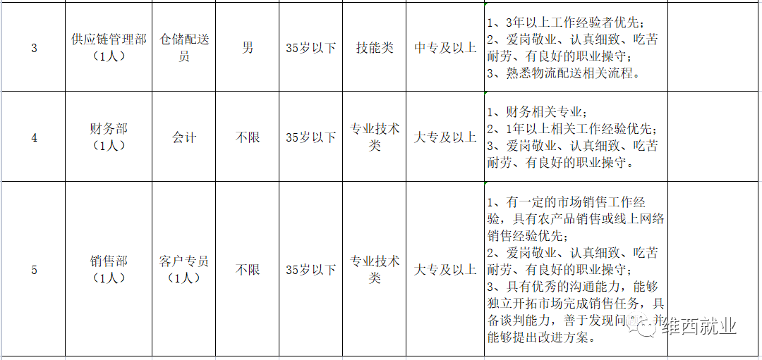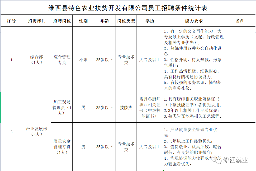 为加强维西县特色农业扶贫开发有限公司队伍建设,缓解扶贫开发公司缺员现状,满足部门一线岗位人力资源配置急需专业人才紧缺问题,经维西县人力资源和社会保障局研究同意,现拟向州内外社会招聘市场营销、食品质量与安全、财务管理、文秘、行政管理等专业人员6名。现将有关事项公告如下: