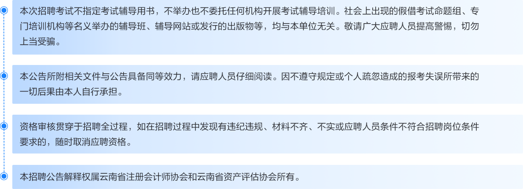 为保证本次招聘工作公开、公平、公正,云南省注册会计师协会和云南省资产评估协会将对招聘工作进行全程指导监督。应聘人员如有违反招聘纪律、弄虚作假的行为,一经查实,一律取消考试资格或聘用资格。工作人员如有违反招聘纪律、徇私舞弊行为的,按有关规定给予严肃处理。