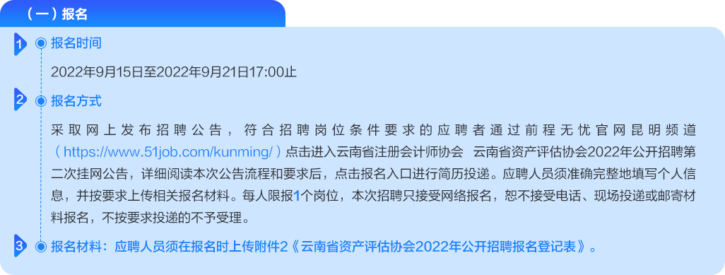 2. 具体招聘岗位、岗位资格条件等信息详见附件1 《云南省资产评估协会2022年公开招聘第二次挂网计划表》。