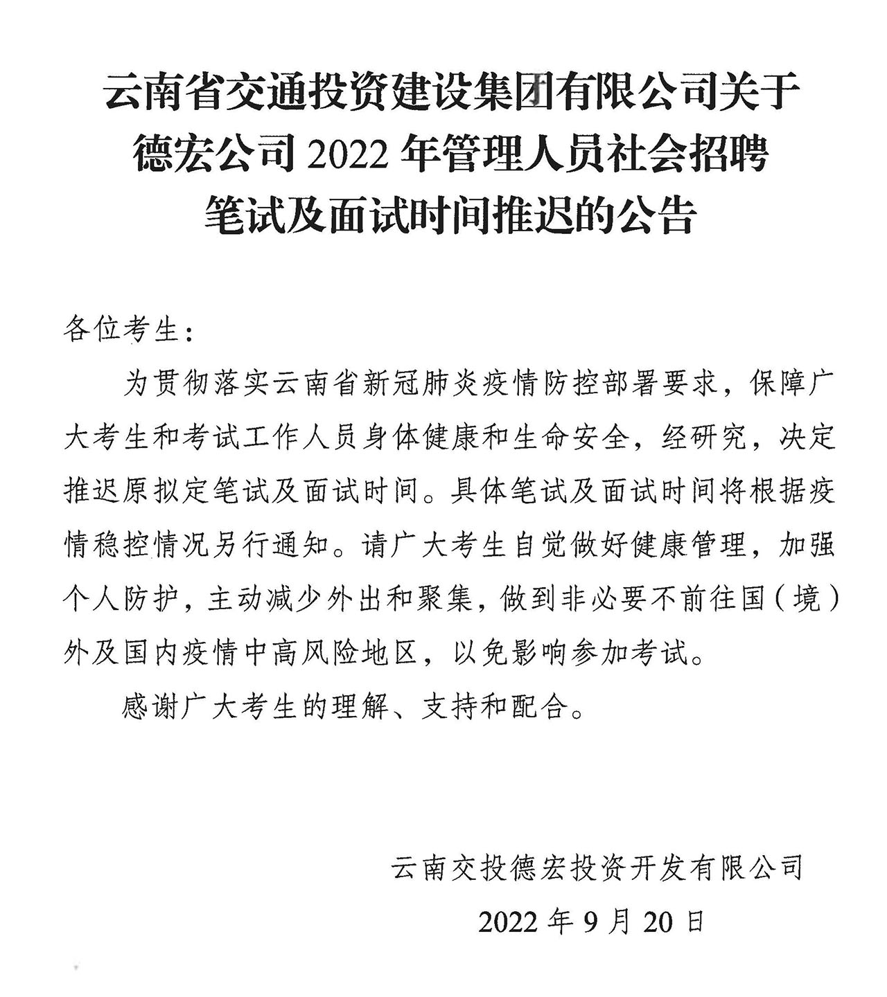 关于德宏公司2022年管理人员社会招聘笔试及面试时间推迟的公告
