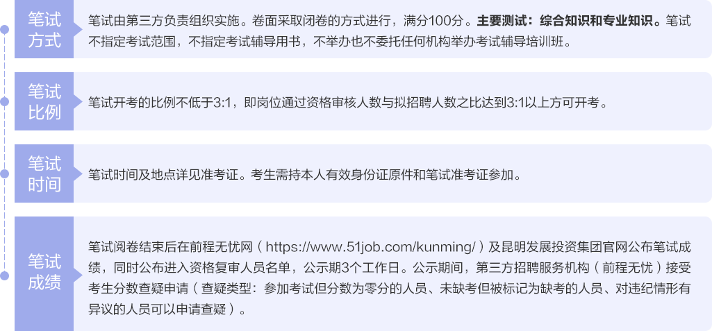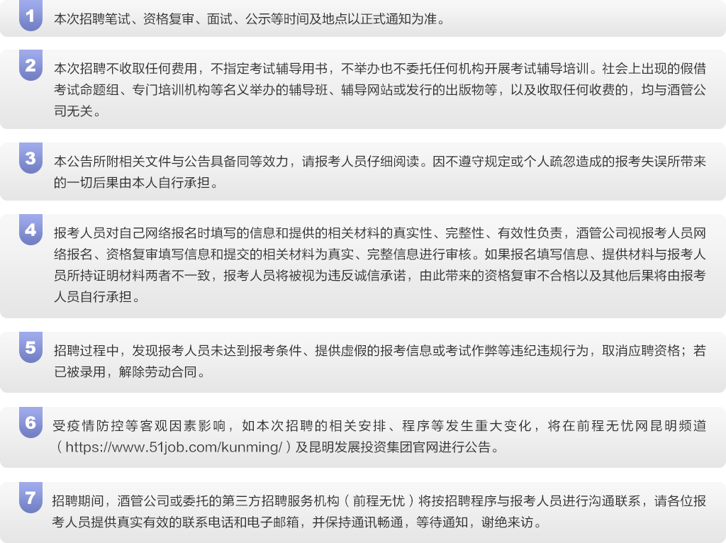 招聘公告及后续各个环节在前程无忧网昆明频道(https://www.51job.com/kunming/)及昆明发展投资集团官网公开发布。报考人员自行登录前程无忧网昆明频道(https://www.51job.com/kunming/)或昆明发展投资集团官网查询获取相关信息,请报考人员关注前程无忧后续通知,因查看不及时或因查看转载信息造成的一切后果由考生自行负责。