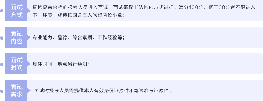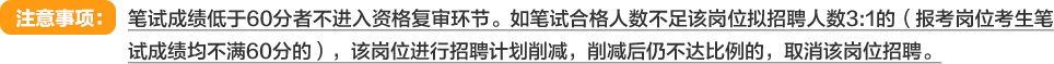 按照笔试成绩从高到低的顺序,以每个岗位进入面试人数与拟招聘人数的比例为3:1确定进入资格复审人选,若确定进入资格复审的笔试成绩最后一名出现并列的,则并列进入资格复审。若资格复审出现证件资料与报名材料不相符的,一律取消面试资格。未在规定时间内参加资格复审的视为主动放弃。因报考人员主动放弃或资格复审不合格等原因达不到面试最低比例的,按笔试成绩从高到低进行依次递补。