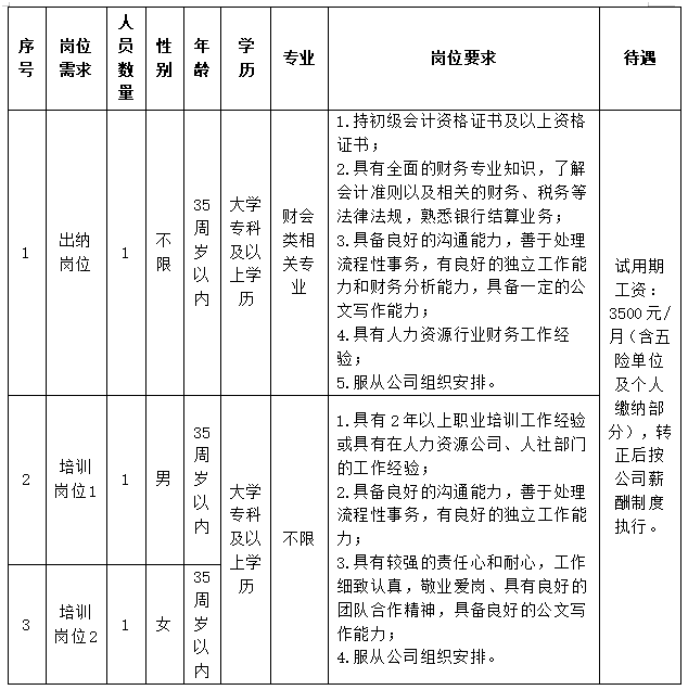 澄江启创职业培训学校有限公司计划公开招聘工作人员3人,其中:出纳岗位1人,培训岗位(男)招聘1人,培训岗位(女)招聘1人。报考人员在符合基本条件基础上,需符合招聘岗位的招聘条件,具体岗位及资格条件详见下表: