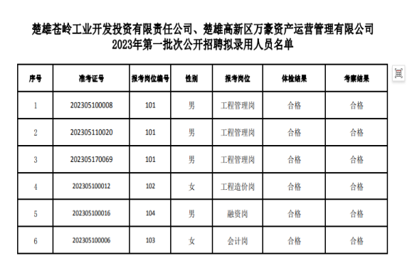 楚雄苍岭工业开发投资有限责任公司、楚雄高新区万豪资产运营管理有限公司2023年第一批次公开招聘工作人员经过公告发布、报名、资格审查、笔试、资格复审、面试、体检、考察等程序,现将拟聘用人员名单予以公示。