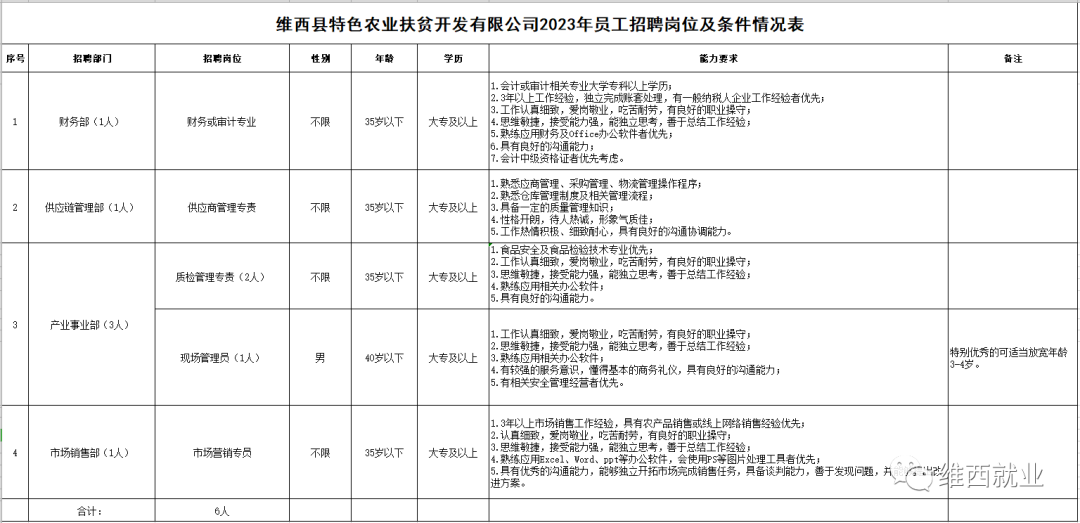 维西县特色农业扶贫开发有限公司,因工作需要,特面向社会公开招聘工作人员6名,现将有关事项公告如下: