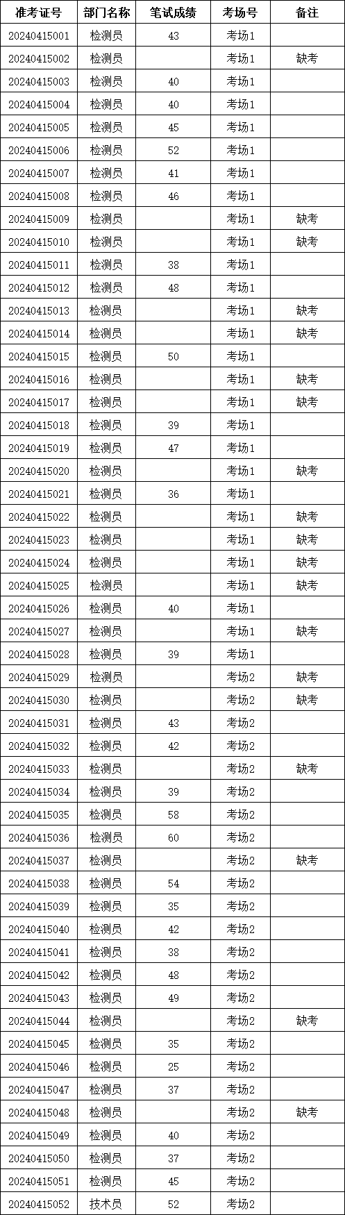 澄江市智谦建设工程质量检测有限公司2024年公开招聘工作人员笔试,于2024年4月15日结束,根据《澄江智谦建设工程质量检测有限公司2024年公开招聘工作人员公告》笔试成绩满分为100分,现将笔试成绩名单公示如下: