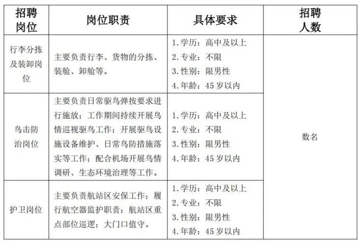 根据工作需要,公司决定面向社会公开招聘迪庆香格里拉机场网点行李分拣及装卸员、护卫员、鸟击防治员等。现将招聘内容公告如下: