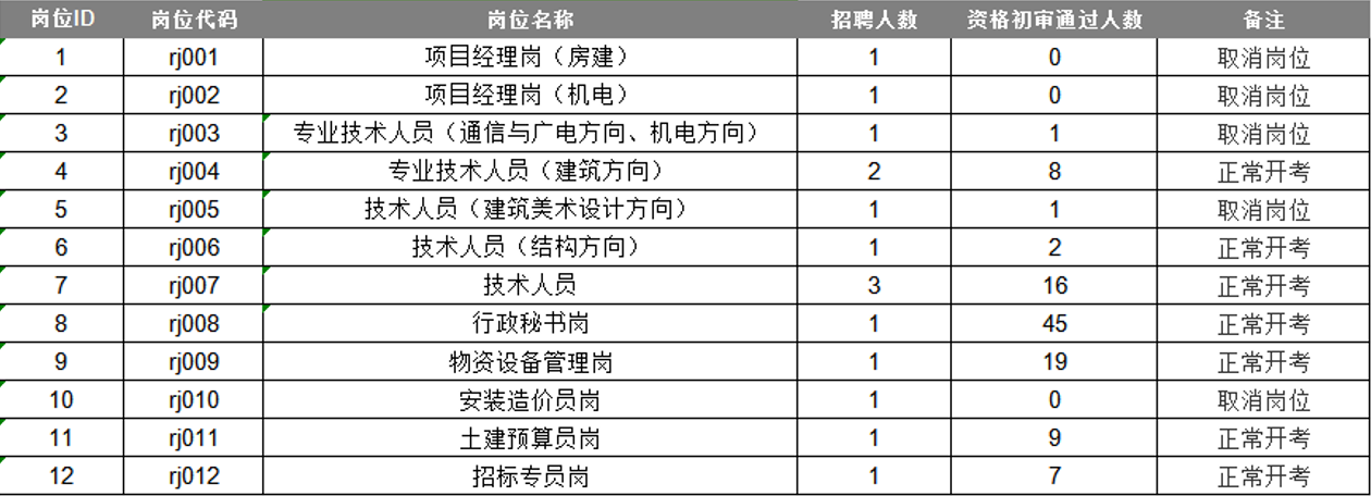 根据《云南睿建工程有限公司2024年面向社会公开招聘工作人员公告》,经资格初审后,报招聘工作领导小组研究讨论,将开考比例调整至1:2,仍未未达到开考比例的,对该岗位招聘工作予以取消,其他岗位正常进行,具体情况如下:
