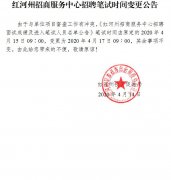 云南考试在线整理2020年红河州招商服务中心招聘笔试时间变更公告以供广大网友查阅,详情内容如下所示: