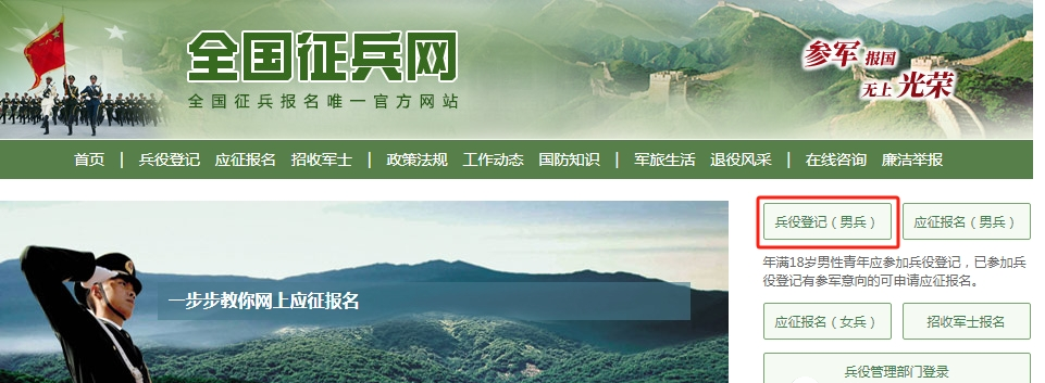 1.打开全国征兵网(www.gfbzb.gov.cn),点击“兵役登记(男兵)”,注册个人账号(牢记用户名及密码)。