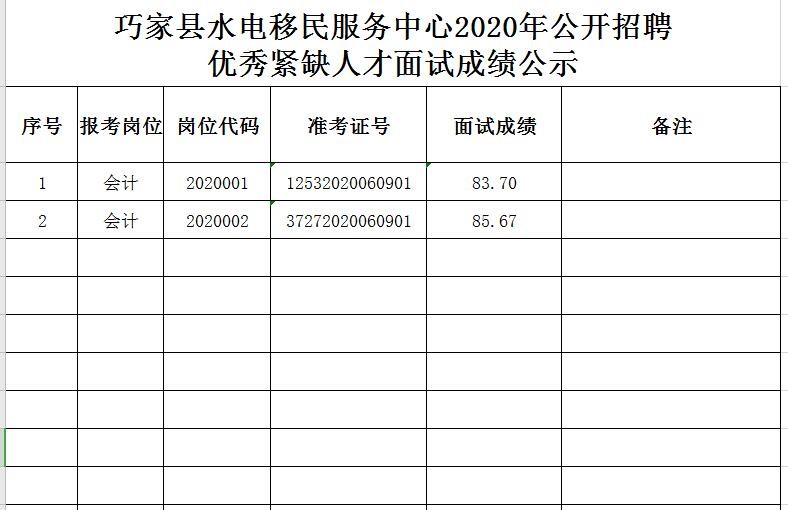 根据《昭通市2020年事业单位公开招聘紧缺专业人才实施办法》(昭人社通[2020]44号)通知要求,现将巧家县水电移民服务中心2020年公开招聘优秀紧缺人才面试成绩公示如下: