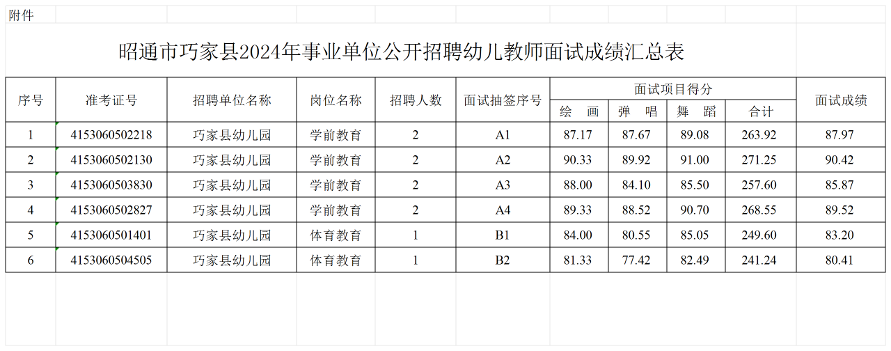 根据《昭通市2024年事业单位公开招聘工作人员通告(第一号)》《昭通市2024年事业单位公开招聘幼儿教师面试通告》,昭通市巧家县2024年事业单位公开招聘幼儿教师面试工作已完成,现将面试成绩公示如下。公示时间为3个工作日,若有异议,请联系巧家县教育体育局人事股,联系电话:0870-7127016。