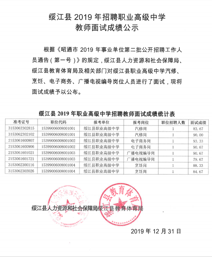 绥江县2019年招聘职业高级中学教师面试成绩公示