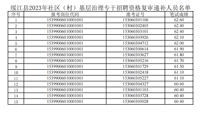 根据云南省2023年社区(村)基层治理专干招聘工作有关要求,绥江县首轮资格复审工作已结束,因部分考生自动放弃资格复审或资格复审不合格,需进行递补。现将递补人员资格复审相关事项公告如下: