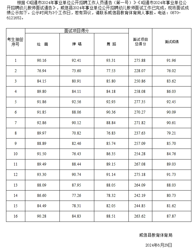 威信县2024年事业单位公开招聘幼儿教师面试成绩公示