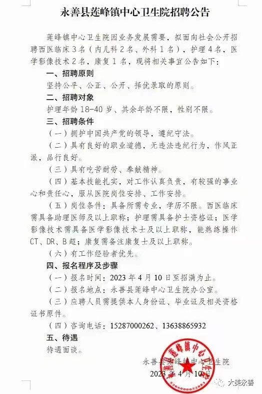 永善县莲峰镇中心卫生院招聘公告