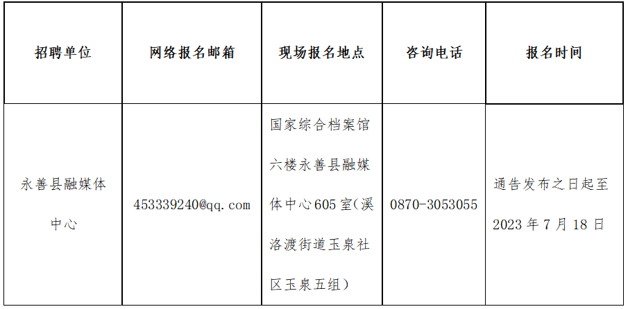 | 1 | 永善县融媒体中心 | 昭通市 | 永善县 | 财政全额拨款 | 记者 | 从事新闻采访、编辑及相关工作。 | 2 | 本科及以上 | 普通招生计划 | 学士及以上 | 面试 |