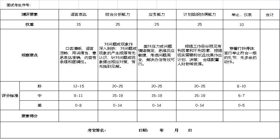 (二)《面试评分表》必须经面试评委签字后有效,《面试结果汇总表》必须经所有面试评委、记分员签字并经监督人员审核签字后有效。