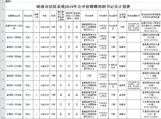 1、《昭通市法院系统2019年公开招聘聘用制书记员计划表》;