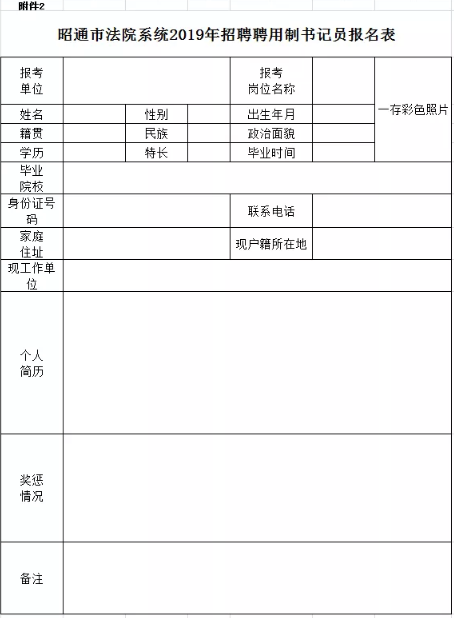 2、《昭通市法院系统2019年招聘聘用制书记员报名表》。