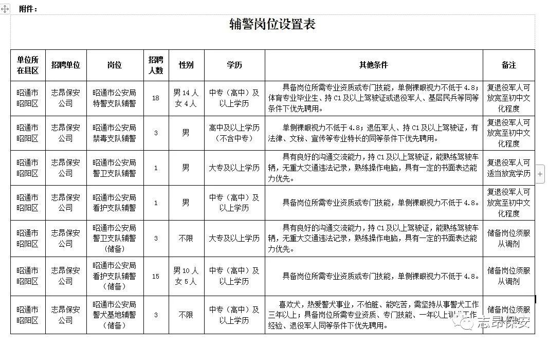 (二)派遣岗位:昭通市公安局辅警(具体岗位见附件《辅警岗位设置表》)