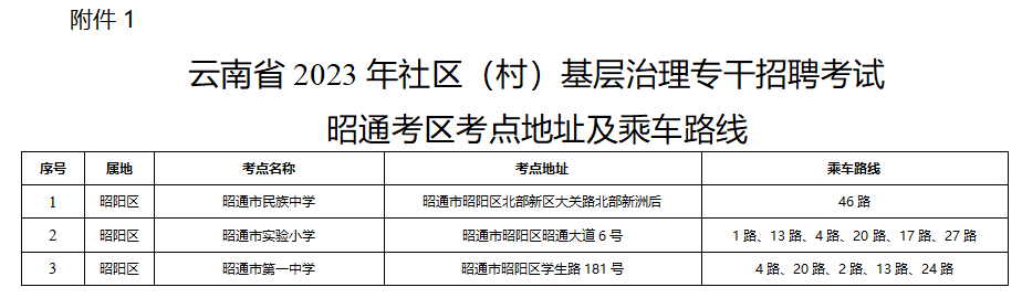 附件:1.云南省2023年社区(村)基层治理专干招聘考试昭通考区考点地址及乘车路线