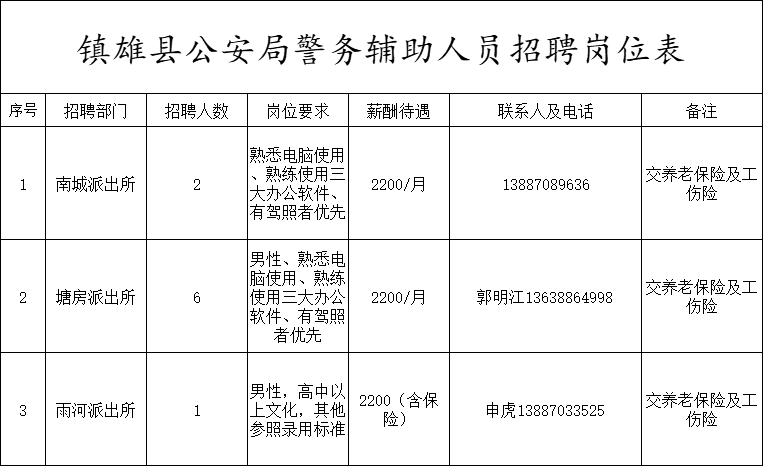 岗位设置、工资待遇以及其他要求,详见《镇雄县公安局警务辅助人员招聘岗位表》(附件)。