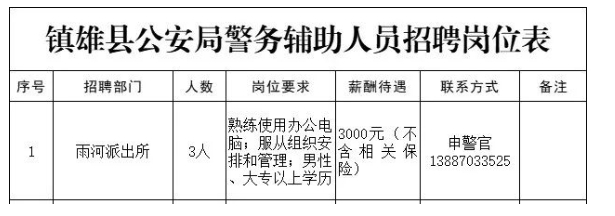 岗位设置、工资待遇以及其他要求,详见《镇雄县公安局警务辅助人员招聘岗位表》(附件)。